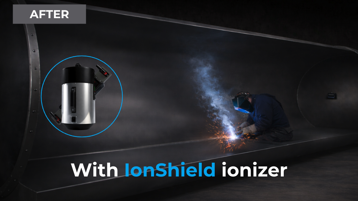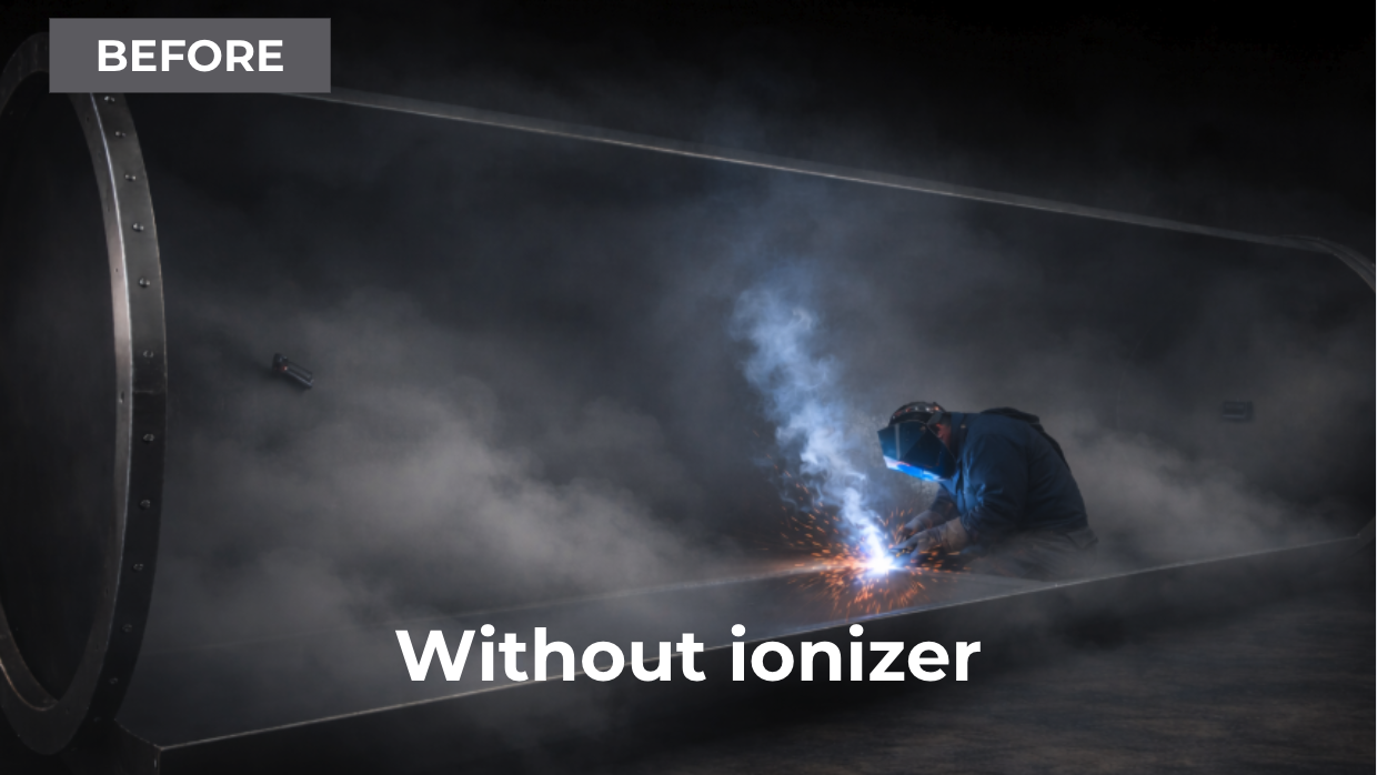 Ionization promotes the agglomeration of water molecules onto pollutants, increasing their volumetric density. This phenomenon makes particles heavier and reduces fume volatility: welding microparticles cluster into larger agglomerates that settle rapidly. These deposits on the ground are easier to clean than fine airborne dust, remaining outside the workers’ breathing zone.